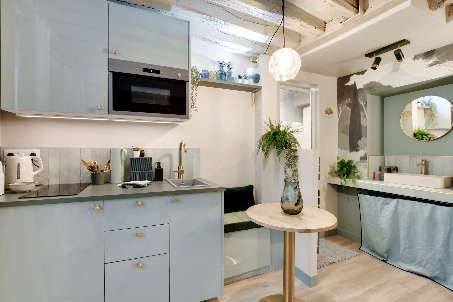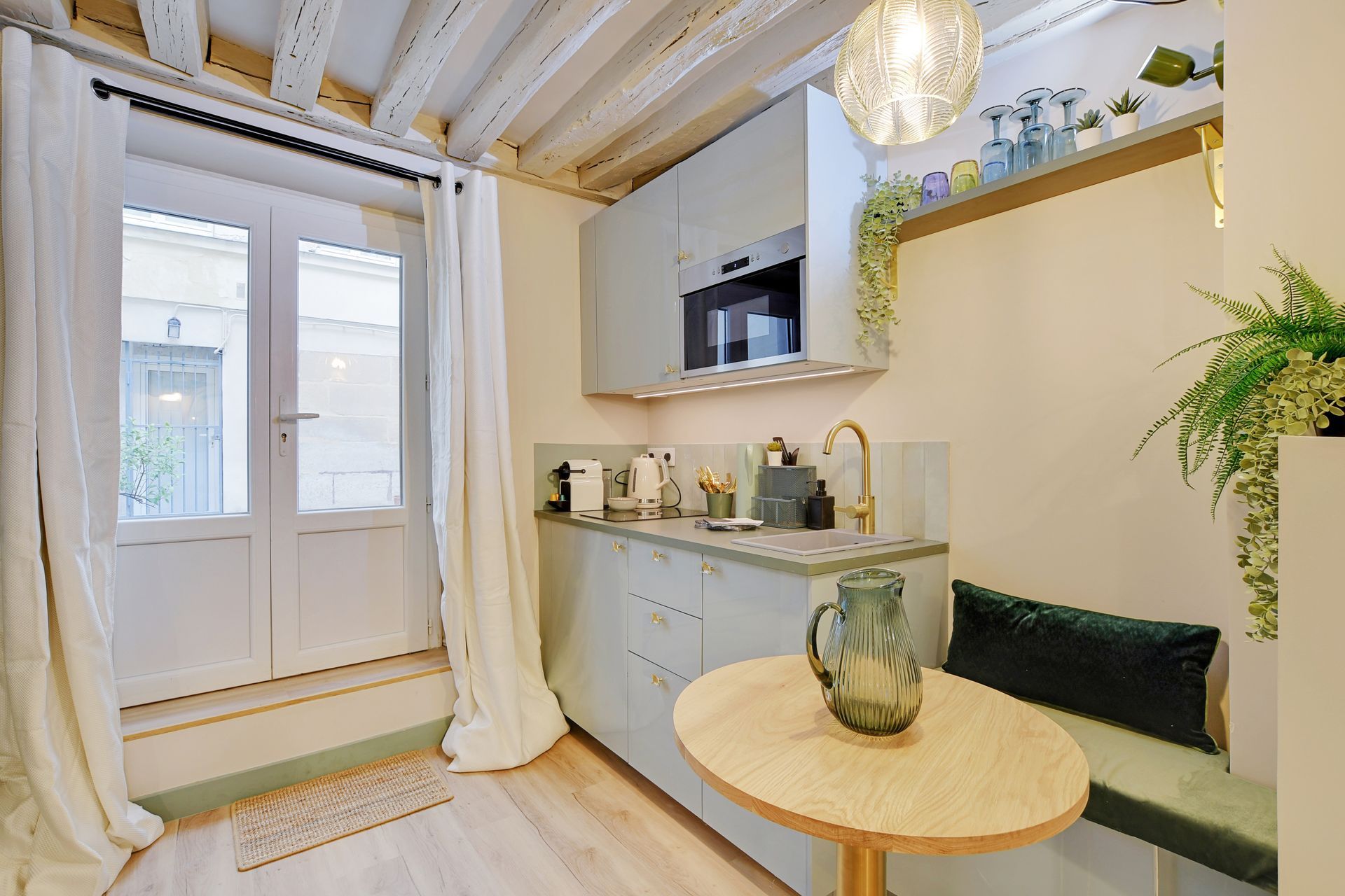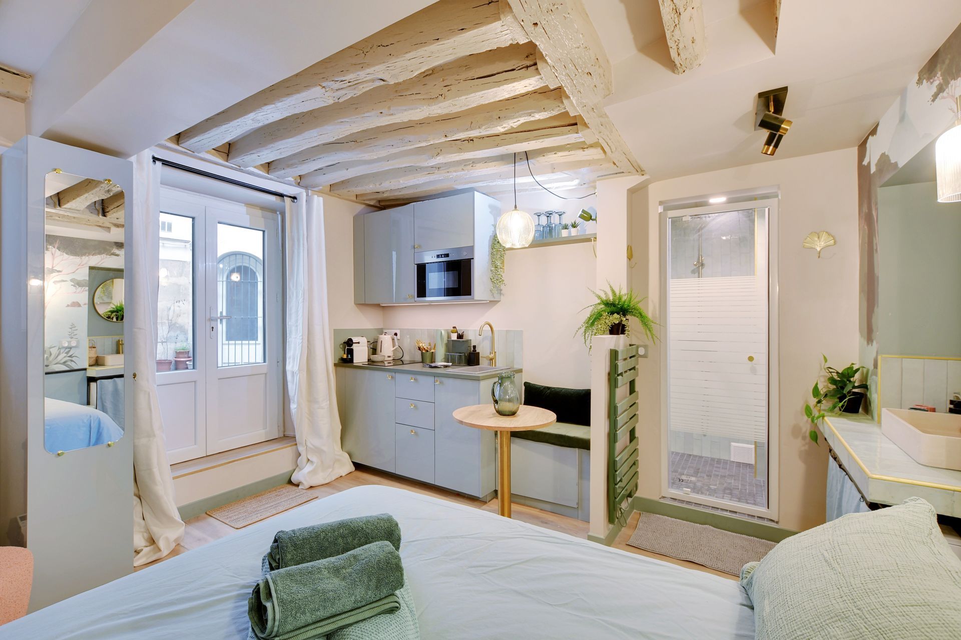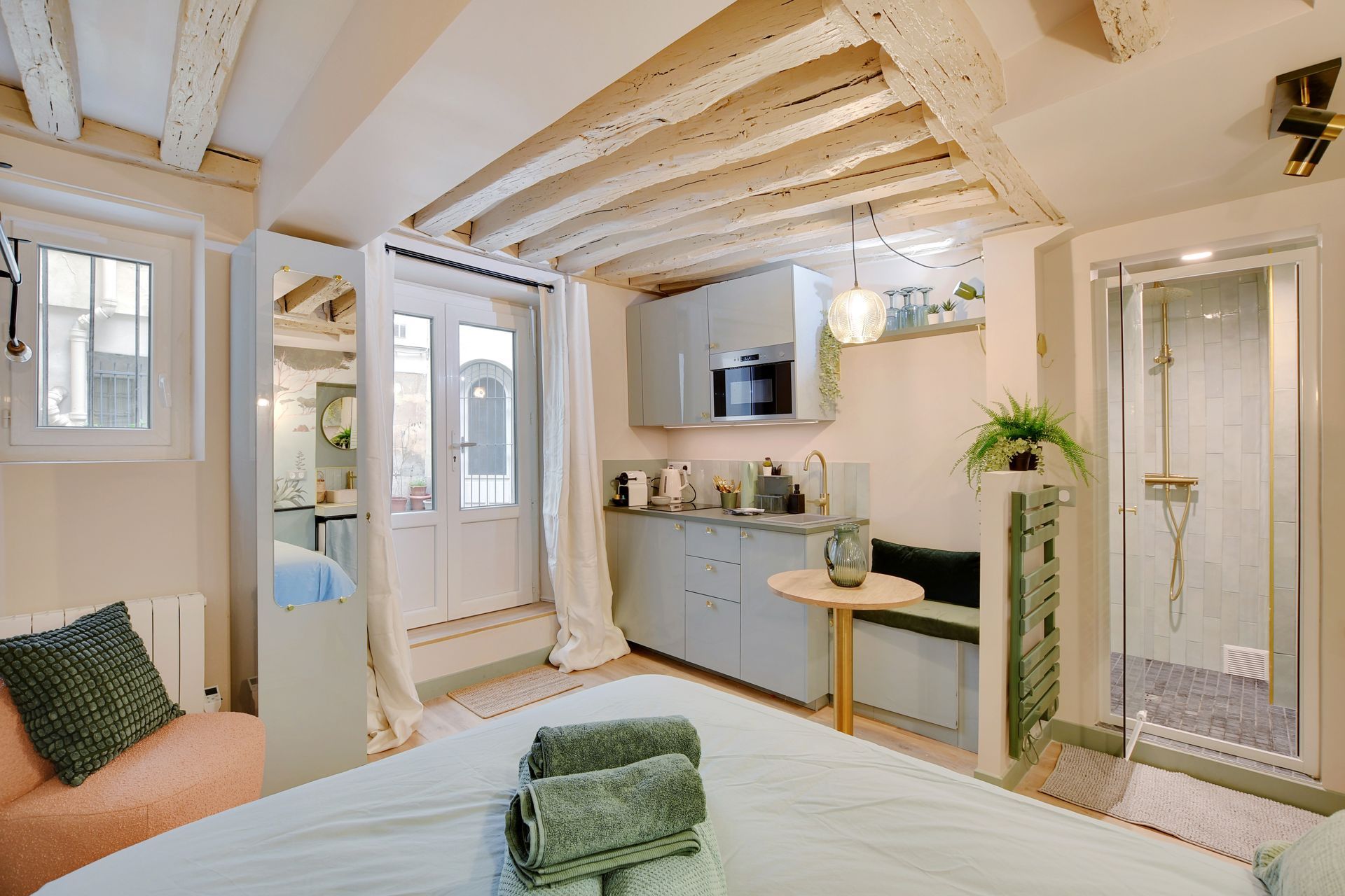 This charming studio apartment has just been renovated and furnished by a renowned architect, and is located close to the main attractions of Paris. Perfect for a business trip, as a couple or with friends. Ideally located in the Marais district, close to rue de Bretagne and rue du Temple. Comfortable, modern and functional, this flat for 2 people has a lounge area with double bed, kitchen, shower room, WC, Wi-Fi and washing machine.