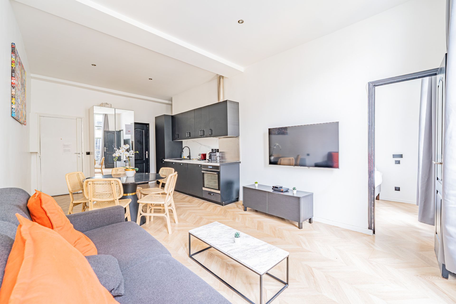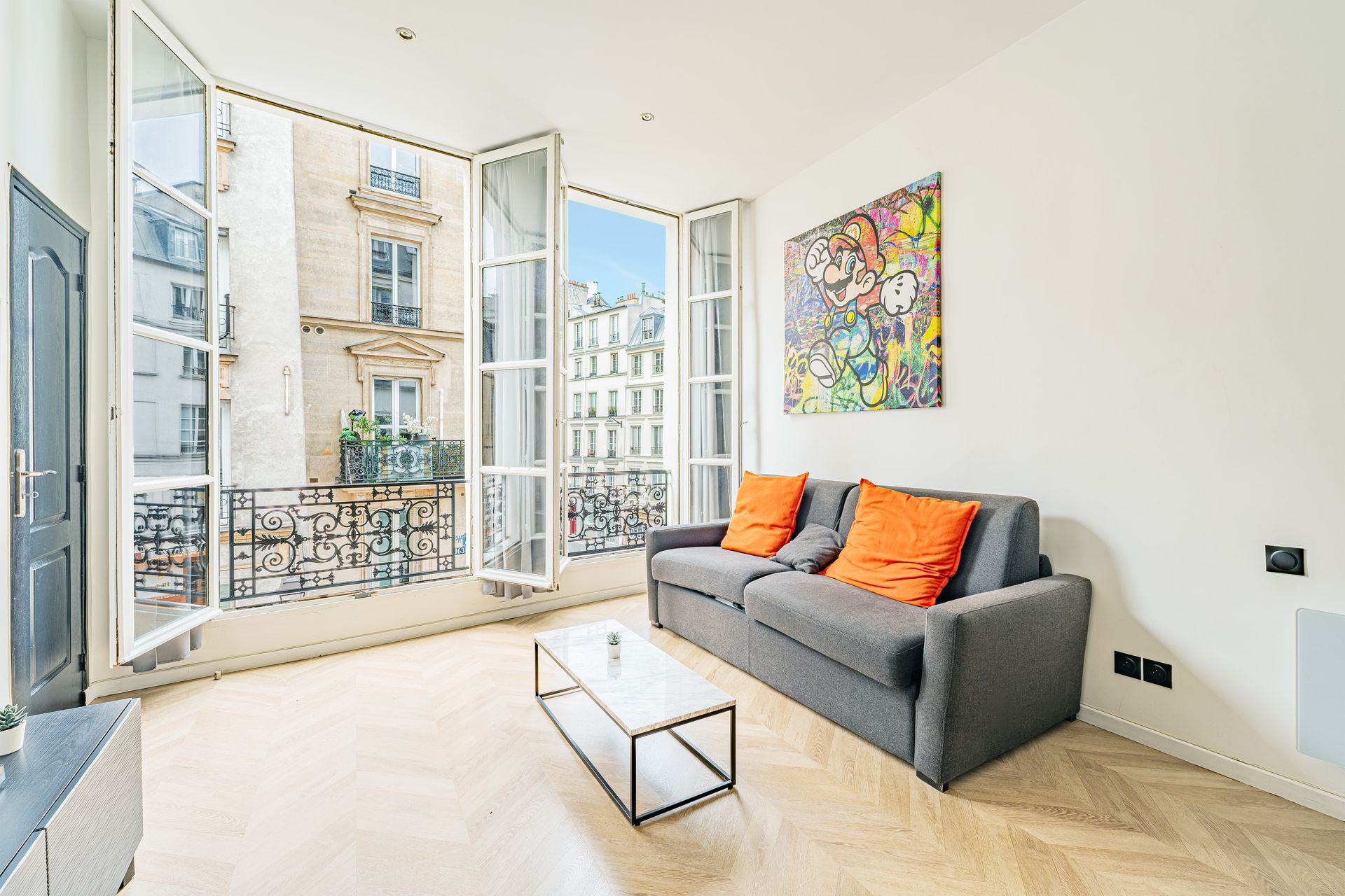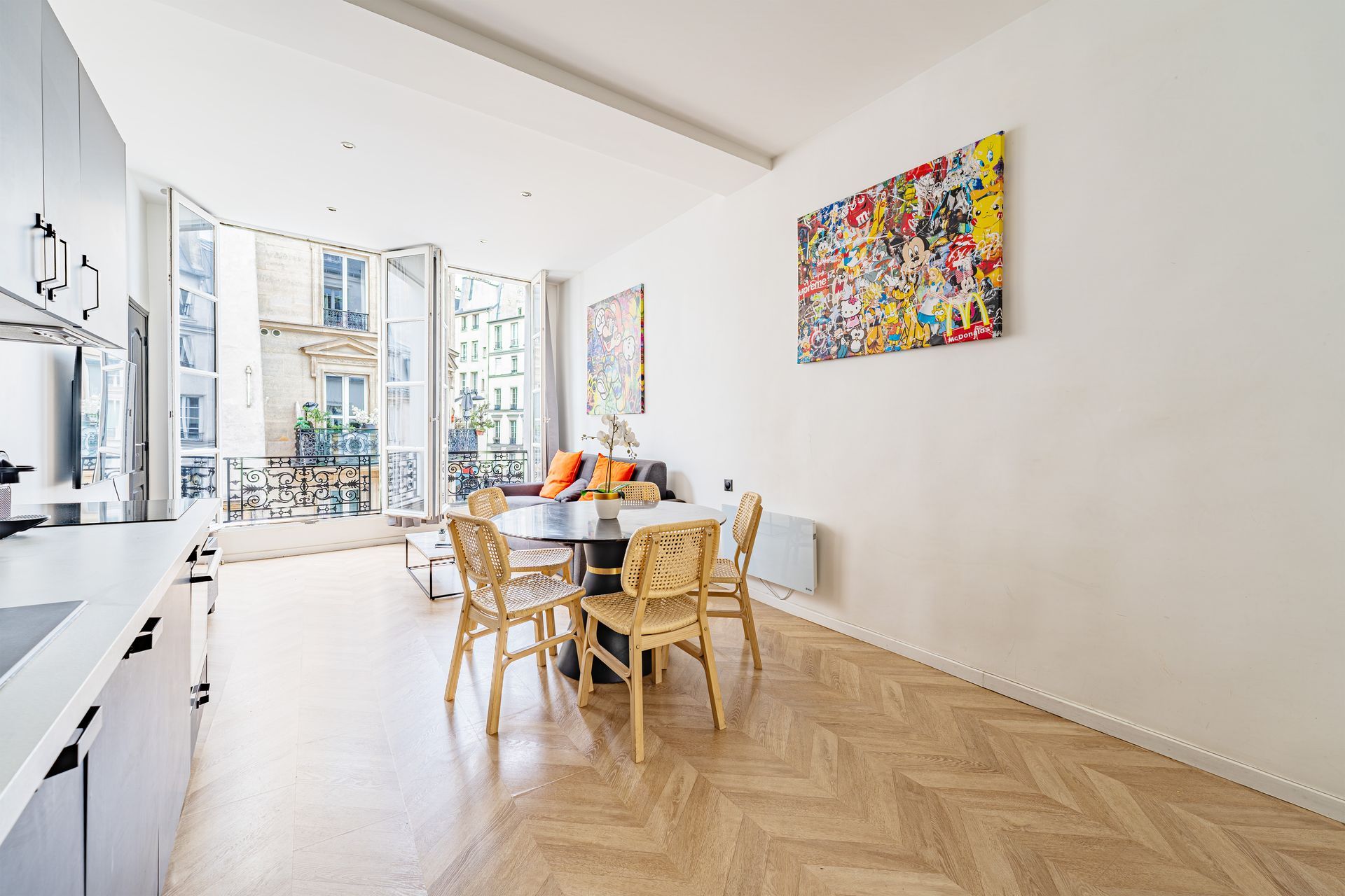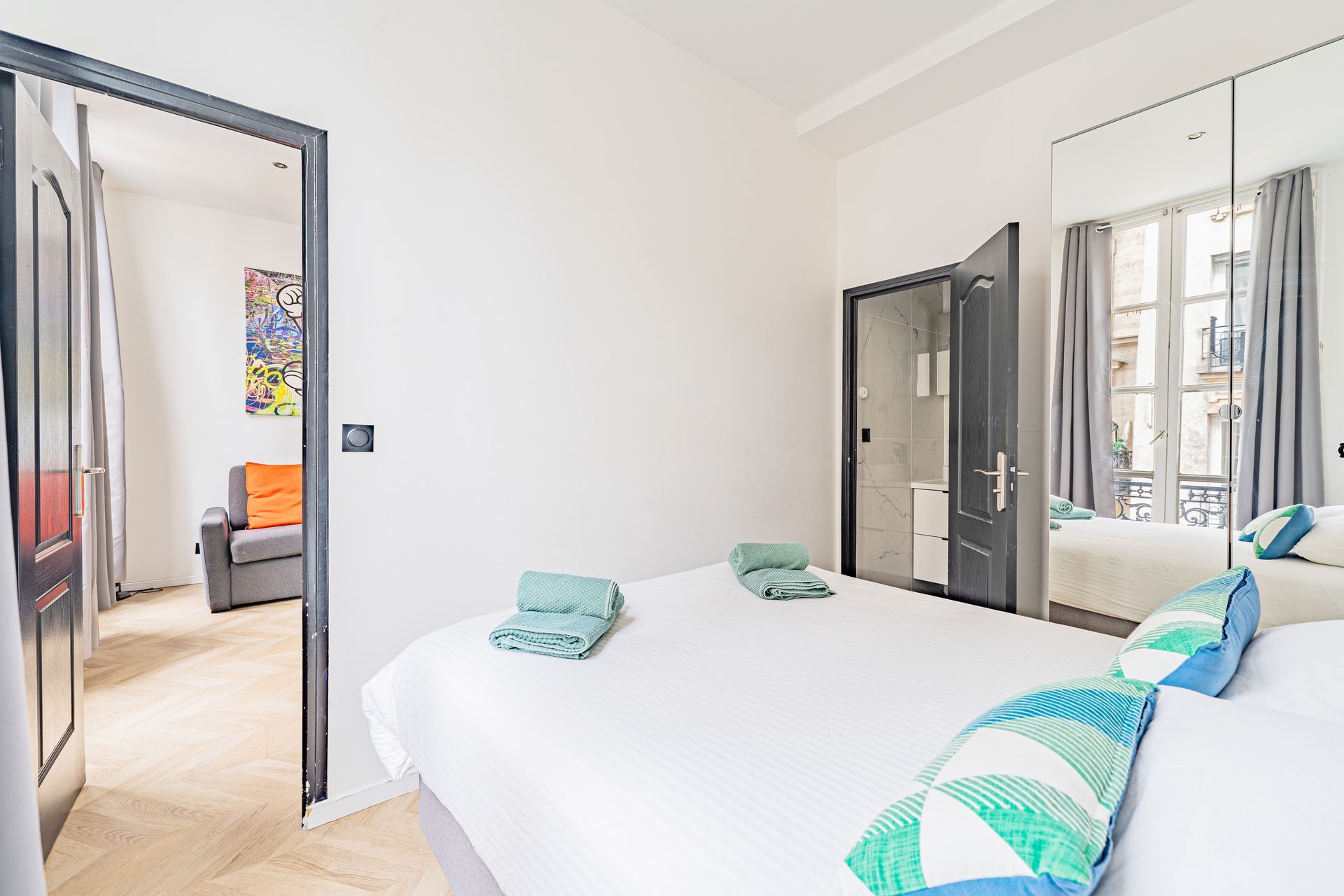 Elegant and functional flat with 3 bedrooms, 3 double beds and 2 bathrooms/2WCs, ideally located in the heart of the vibrant and typically Parisian Marais district. With views of the famous Rue du Temple and Rue de Bretagne, you can enjoy the sights of Paris on foot. The comfortable, modern and functional layout of this flat, which can accommodate up to 7 people, will delight you during your stay in Paris with family or friends.
